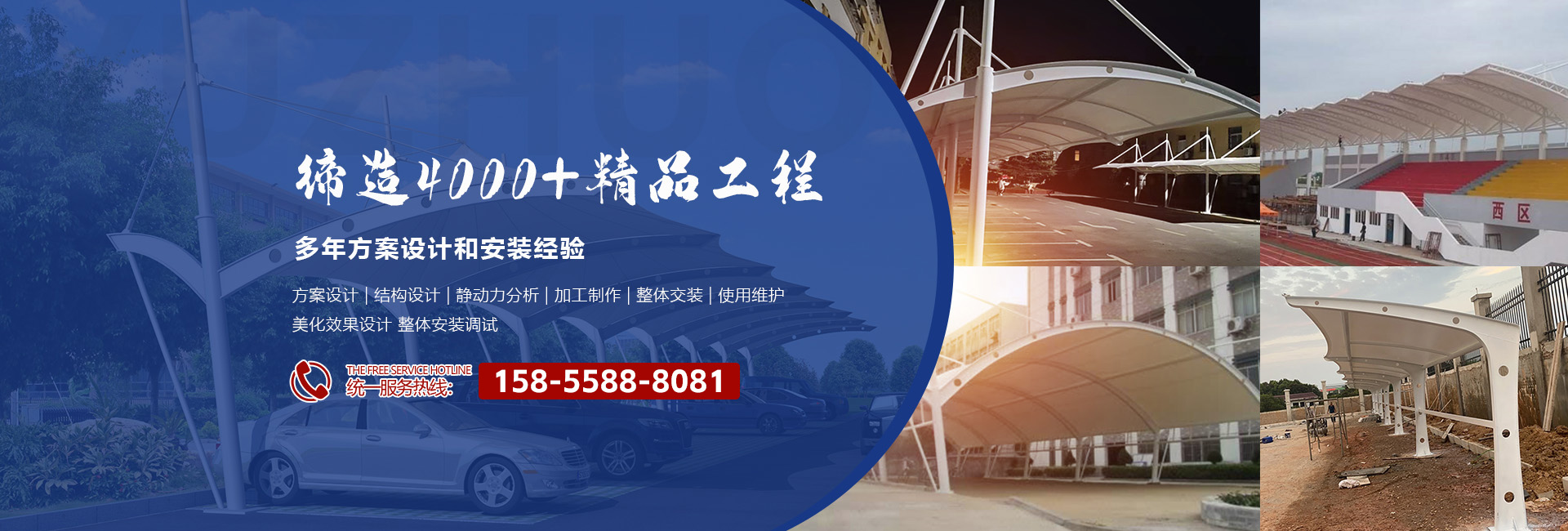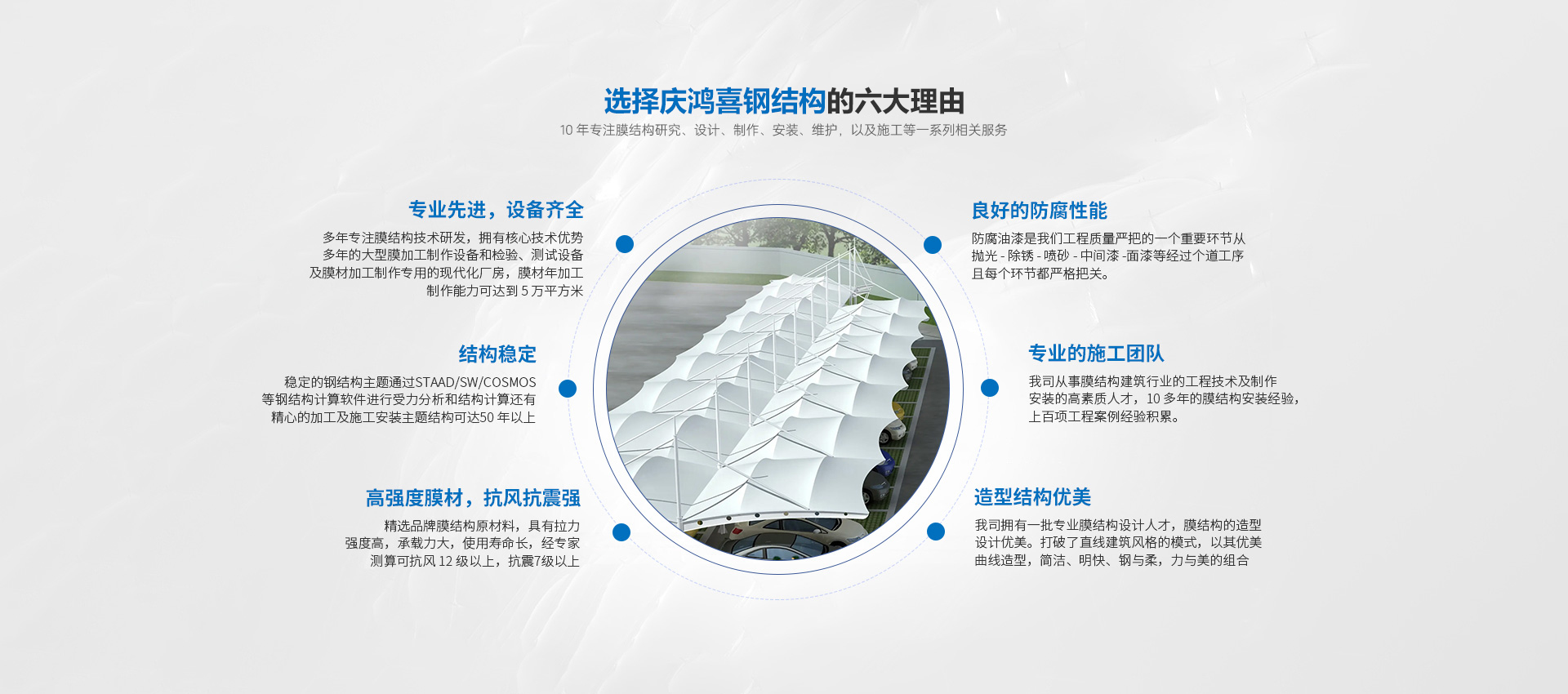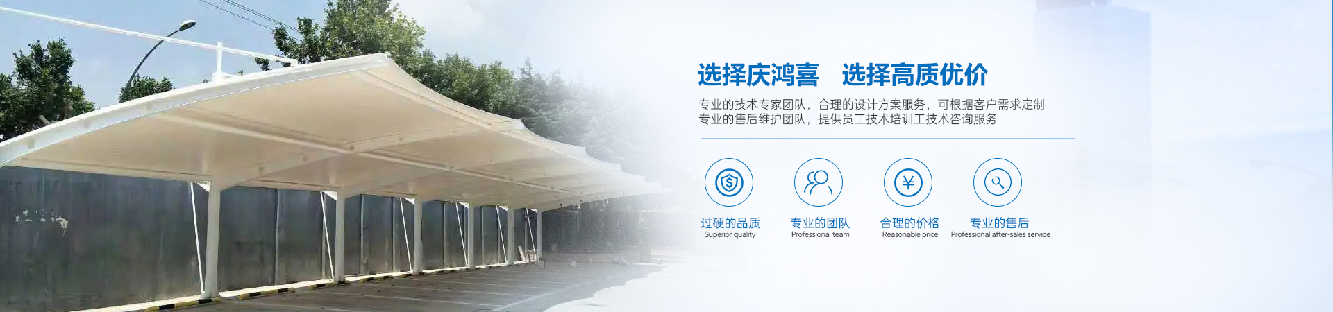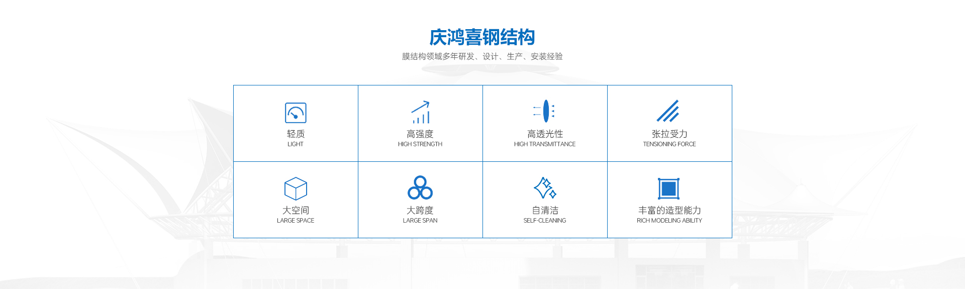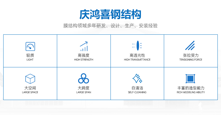 MORE+????????安徽省慶鴻喜鋼結構有限公司是一家專業(yè)從事膜結構工程的綜合性公司。公司秉承“信譽第一、質量第一”的宗旨。開拓、發(fā)展、創(chuàng)新的理念。目前公司主營膜結構設計、膜裁剪設計、膜材加工及鋼結構安裝與維修。公司擁有一批國內較早從事膜結構行業(yè)的高素質技術人員和安裝隊伍,擁有先進的鋼膜設計軟件3D3S、forten32、和FSCAD,在設計上大膽創(chuàng)新,在加工上精益求精,在施工上安全認證,在售后上讓客戶使用放心。